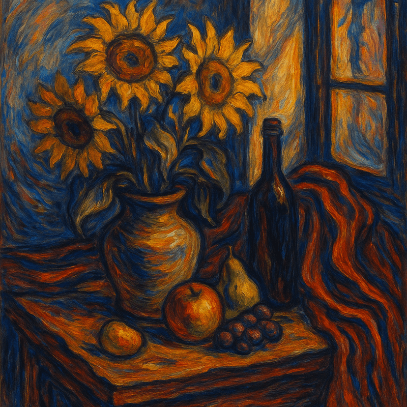 Pinceladas posimpresionistas ondulantes, colores vivos e intensidad emocional que evocan La noche estrellada.